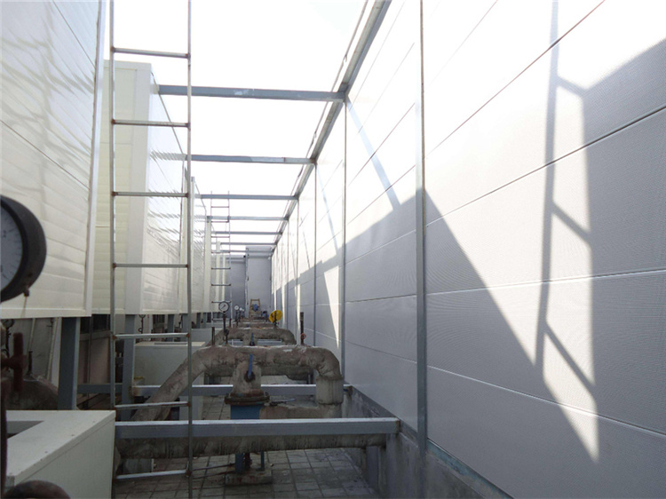 • 冷却塔声屏障分为纯隔声的反射型声屏障,和吸声与隔声相结合的复合型声屏障,后者是更为有效的隔声方法。指的是为减轻行车噪声对附近居民的影响而设置在铁路和公路侧旁的墙式