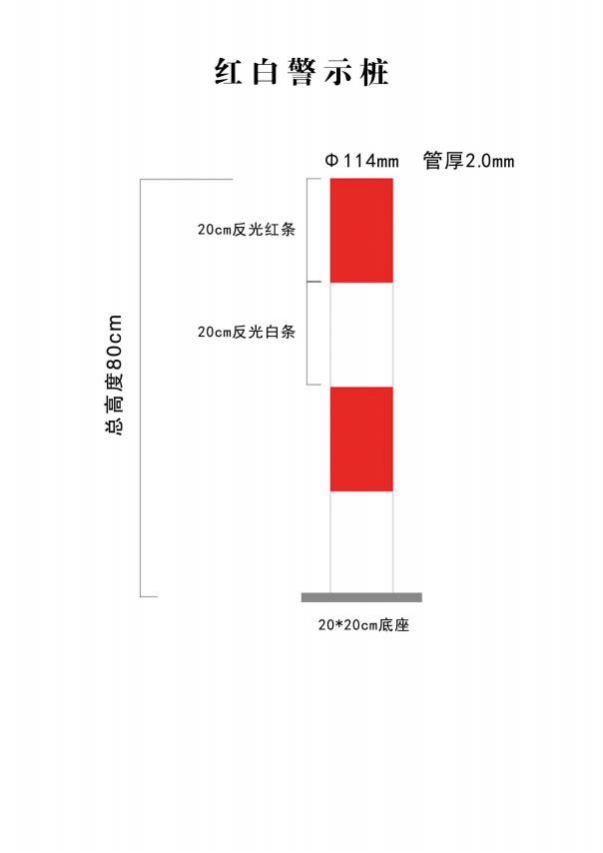 规格:φ114mm管壁厚2.0mm、总高度80cm,20cm红白反光条分层粘贴。